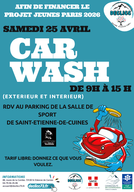 L’association DECLICC et les jeunes du projet « Séjour à Paris » organisent un Car wash à prix libre afin de financer leur projet. Ils laveront l’extérieur et l’intérieur de votre voiture et seront situés devant la salle de sport de Saint-Etienne-de-Cuines (Apex HQ cœur de Maurienne) proches des stations service.
