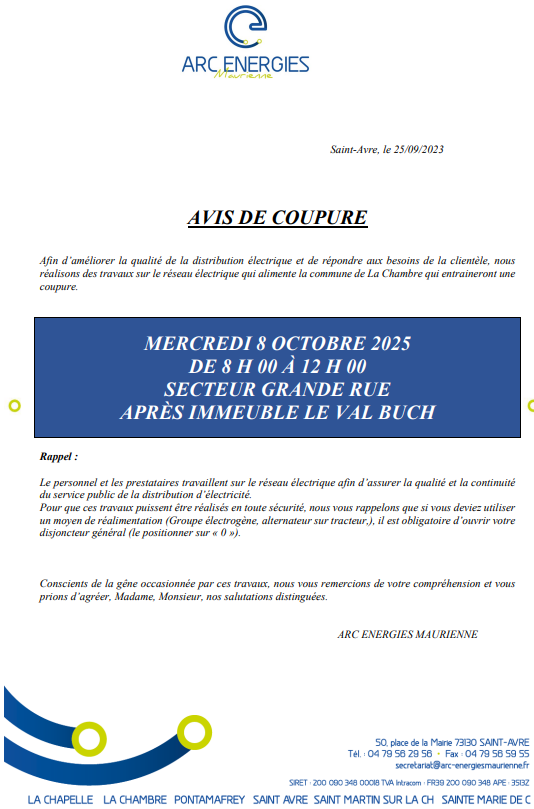 COUPURE ÉLECTRICITÉ – 08/10/2025 24/09/2025 Dans le cadre des travaux de l’îlot CATRIN, une coupure d’électricité est prévue le 8 octobre de 8h00 à 12h00. Administrateur Mairie2025-09-24T10:05:24+00:00