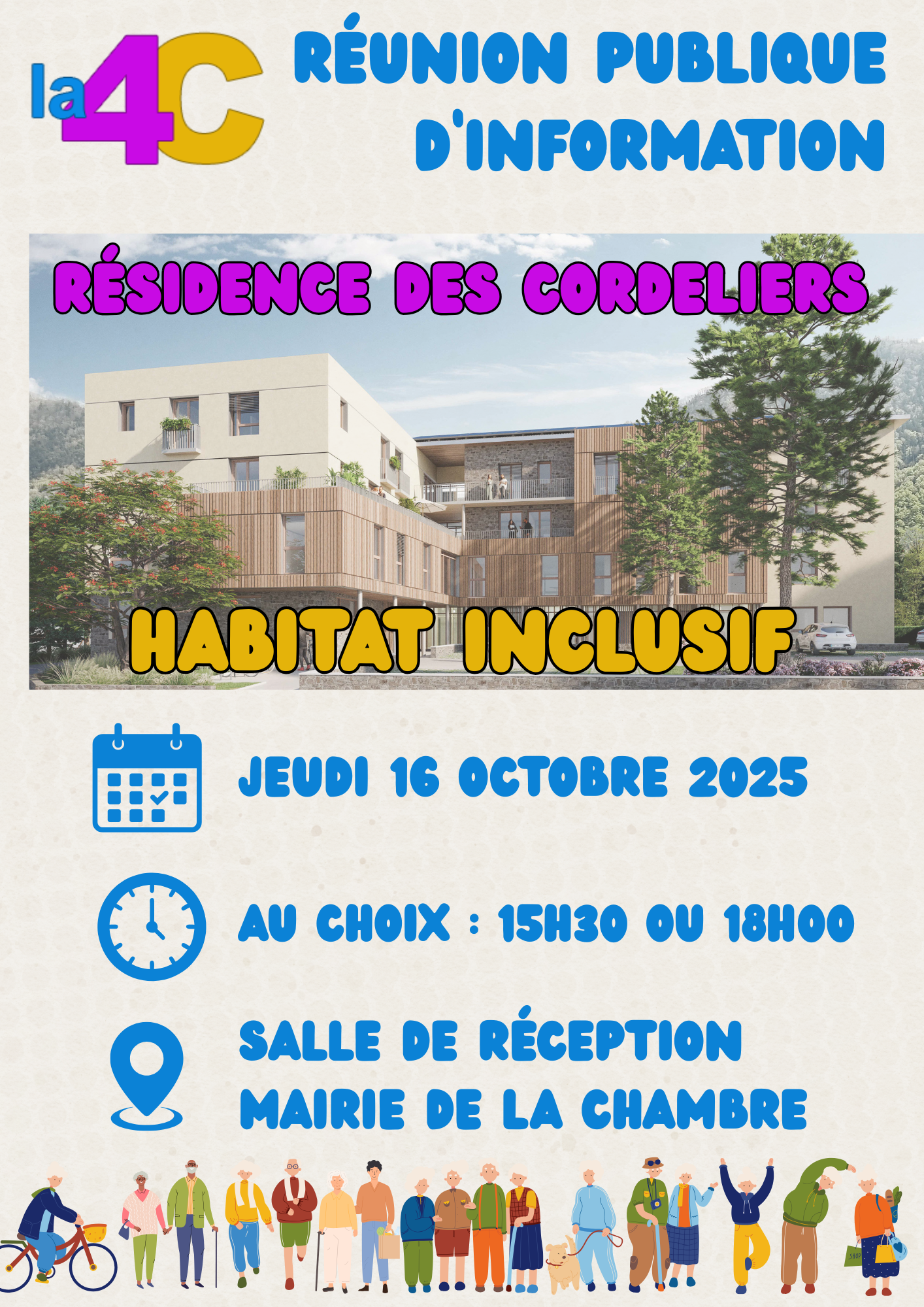 La Communauté de Communes du Canton de La Chambre (4C) vous invite à une réunion publique d’information concernant le projet d’habitat inclusif qui sera prochainement disponible au sein de la résidence des Cordeliers à La Chambre.